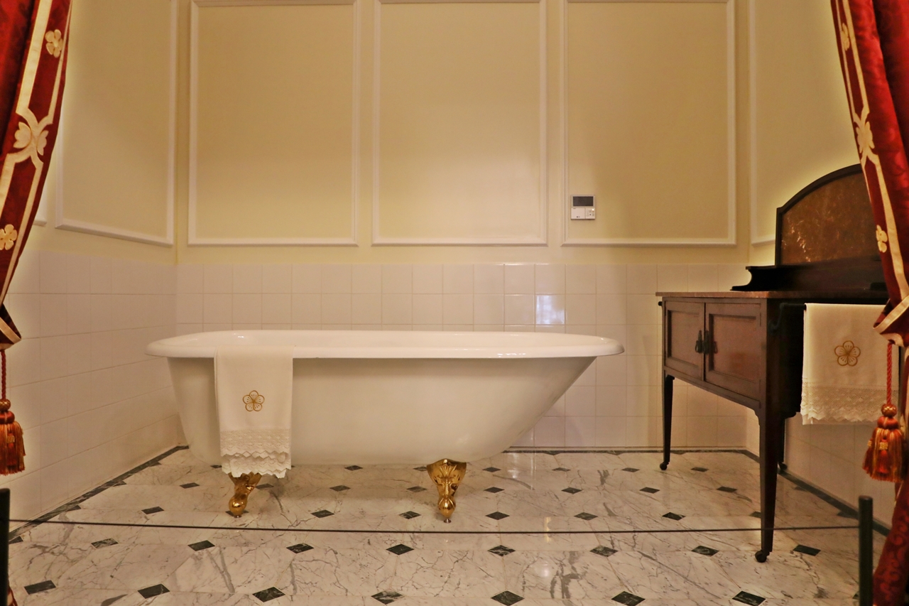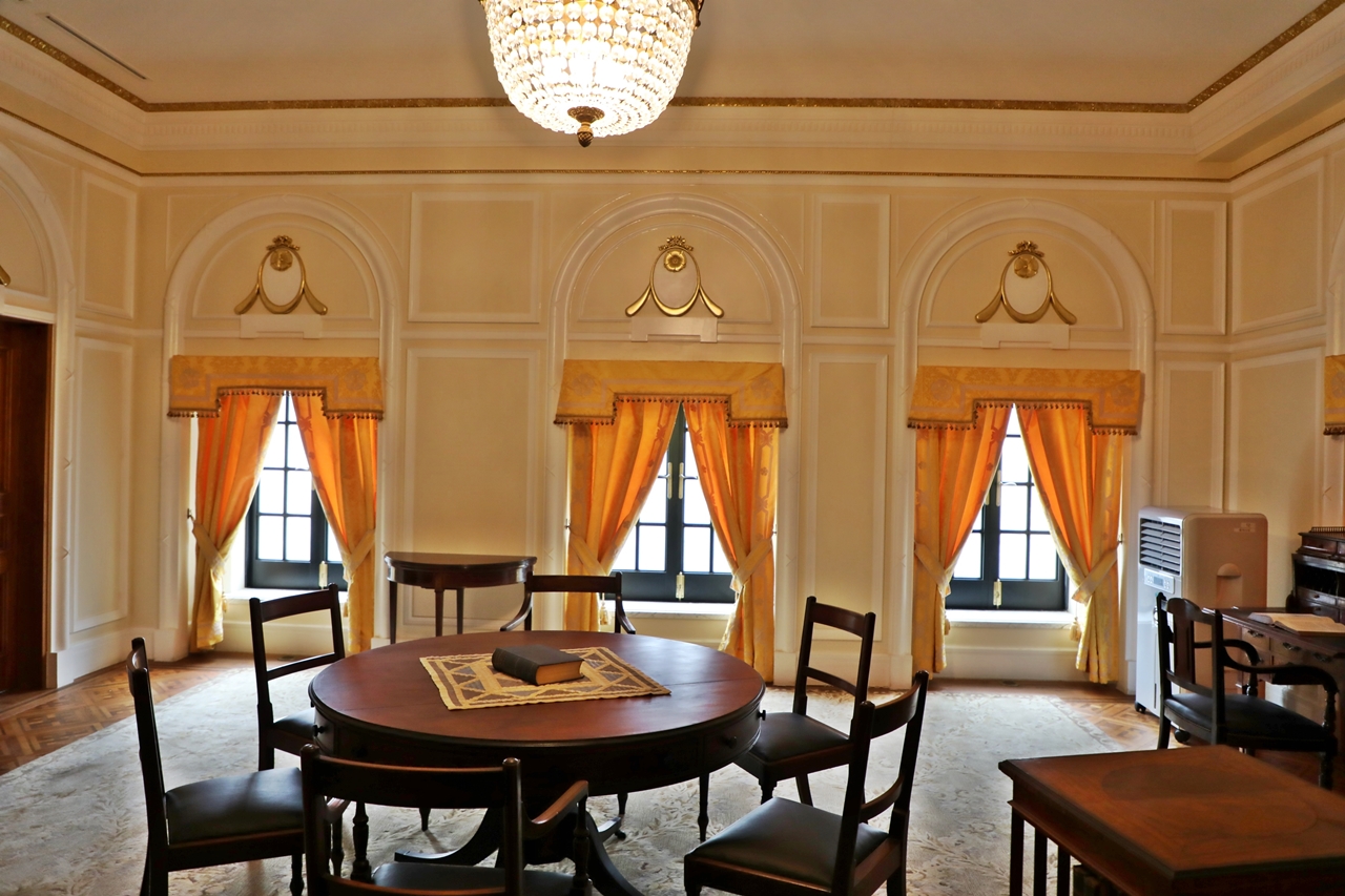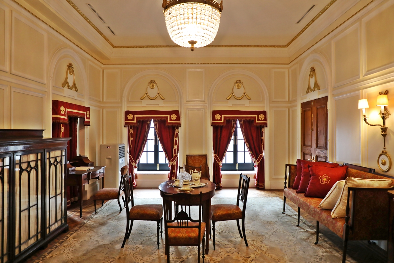 This room was used as a rest area for guests where they had light conversations with courtiers before meeting with the emperor. They were often served Western-style snacks with champagne and biscuits. 'RECEPTION ROOM' was inscribed on the furniture.