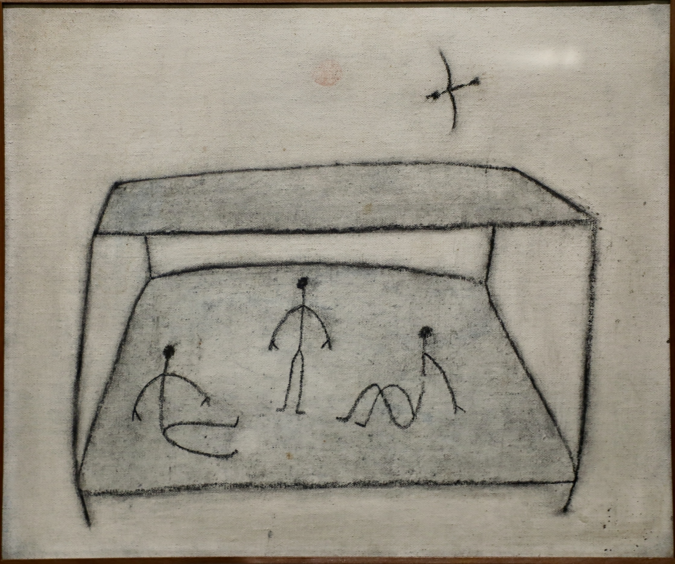 덕소에서 소박하게 생활하며 이웃한 동네의 다양한 삶에도 관심을 가졌던 장욱진은 가옥의 건축 구조를 특유의 방식으로 묘사했다. 단층적 분할 면으로 드러나는 가옥에 철선묘로 묘사한 인물의 쭈그리고 앉은 모습은 특정 인간이 아니라 보편적 인간의 실존적 형상을 선으로 압축하여 조형화한 것이다. 특히 부엌의 오행감을 정면으로 투시하면서도 화면 왼편에는 부뚜막의 가마솥과 큰 주걱을 그려 넣고, 측면 좌상의 인물 배치를 통해 공간의 깊이감을 나타냈다. 캔버스천을 그대로 바탕으로 사용하고 짙은 농묵과도 같은 굵은 선과 면으로 표현해 마치 목탄으로 그린 평판화와 같은 인상을 준다. 이 작품은 생각과 표현을 덜어내면서 얻어 낸 화면을 통해서 탈아(脫我)의 과정을 보여주는 듯해 주목된다.