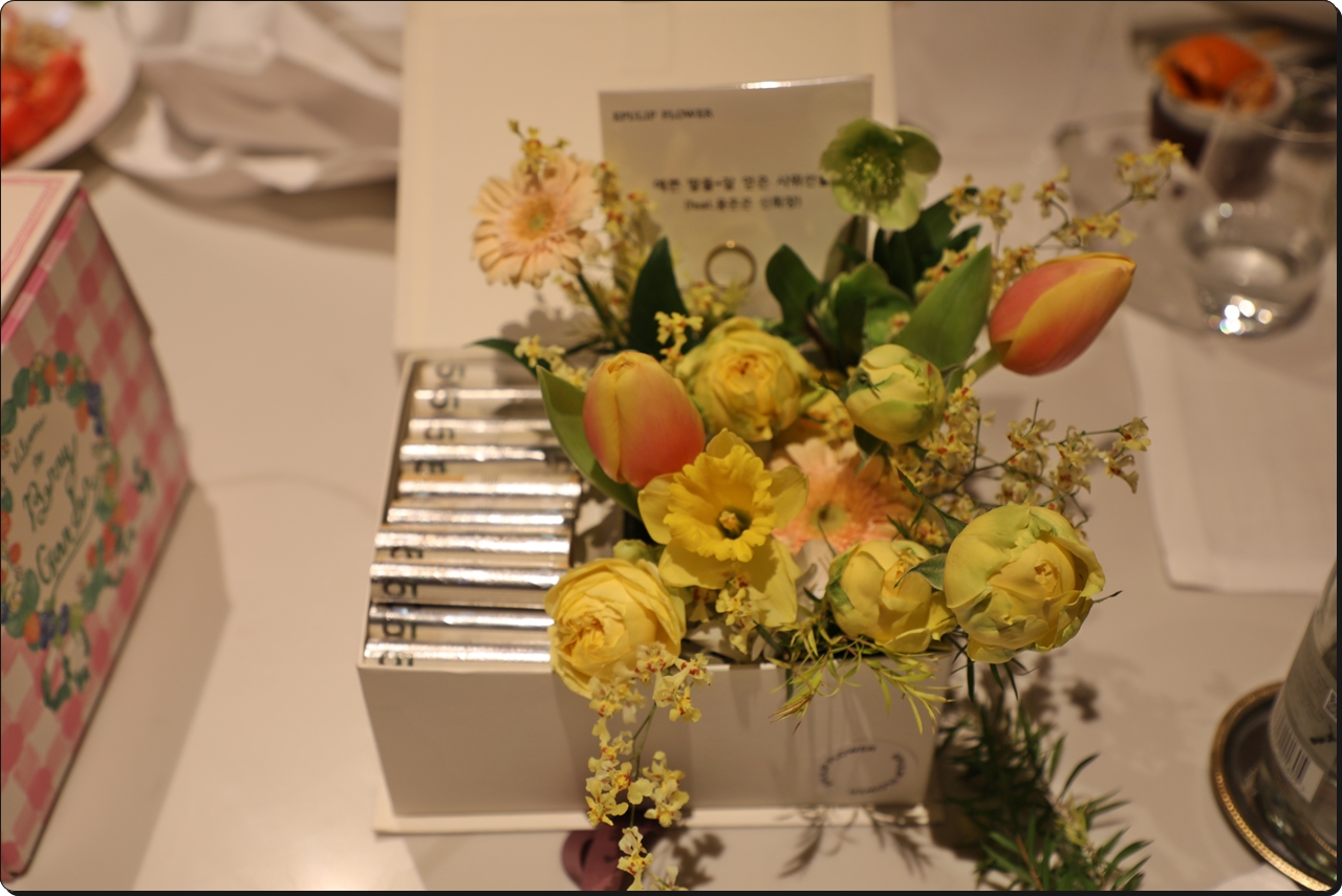 두 딸이 회갑연 비용을 대고 사위가 꽃다발과 함께 5만 원 신권으로 나머지 공간을 채웠다.