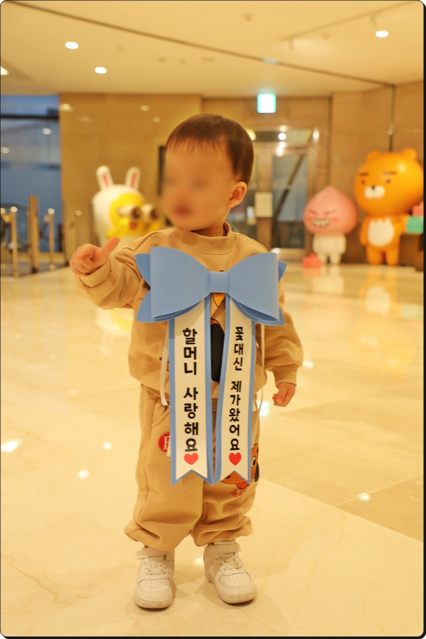 25개월 된 손자는 가슴에 커다란 리본을 달고 "할머니 사랑해요"라며 손 하트를 날린다.