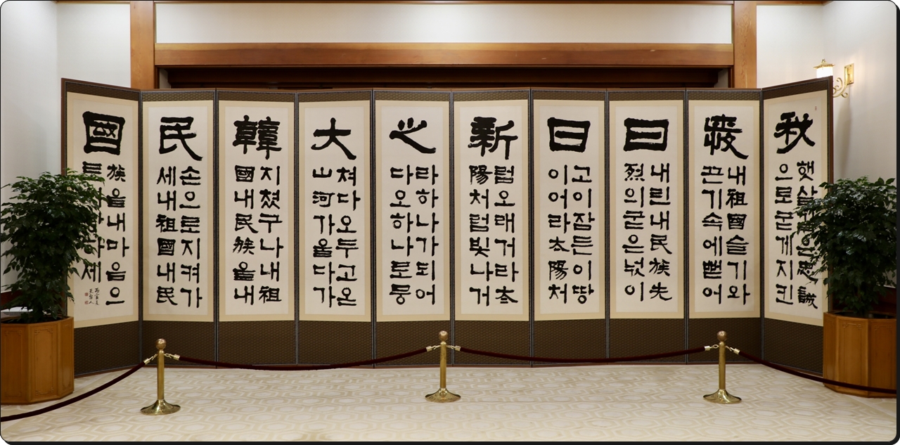 “나는 나날이 새로워지는 대한민국을 사랑한다.”는 제목의 거대한 이 서예병풍은 이수덕 서예가(小堂 李壽德,1926~2020)가 북에 두고 온 고향에 대한 그리움과 분단된 조국의 통일을 기원하는 마음과 애국심을 담고 있다.