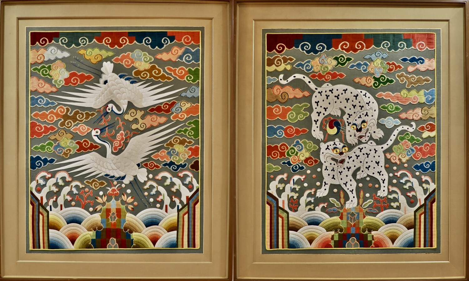 호랑이 두 마리가 그려진 이 흉배는 당상관 이상의 무관이 관복의 앞 뒷면에 착용하여 품계를 표시하는 역할을 하였다. 국무회의장인 세종전실에서 세종실로 들어가는 입구에 각각 문무관을 상징하는 흉배를 배치하고 세종실 북쪽 면에 일월도를 배치함으로써 이 공간이 조선시대 조정을 상징하는 공간임을 알 수 있다.