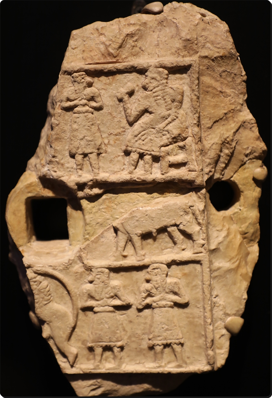 연회와 술 바치는 장면을 묘사한 판 장식을 봉헌하는 것은 기원전 3000-2000년대에 메소포타미아 종교 활동의 한 방법이었다. 여기에는 대개 왕과 왕비, 남자와 여자 사제, 시종들이 한자리에서 술을 마시는 장면이 여러 단으로 묘사되었다. 다양한 계층의 사람들이 남긴 명문은 고대인들의 신앙생활과 의례를 재구성하는 데 도움이 된다. 보통 이런 용도의 부조에는 중간에 벽에 걸기 위한 구멍이 나 있다.