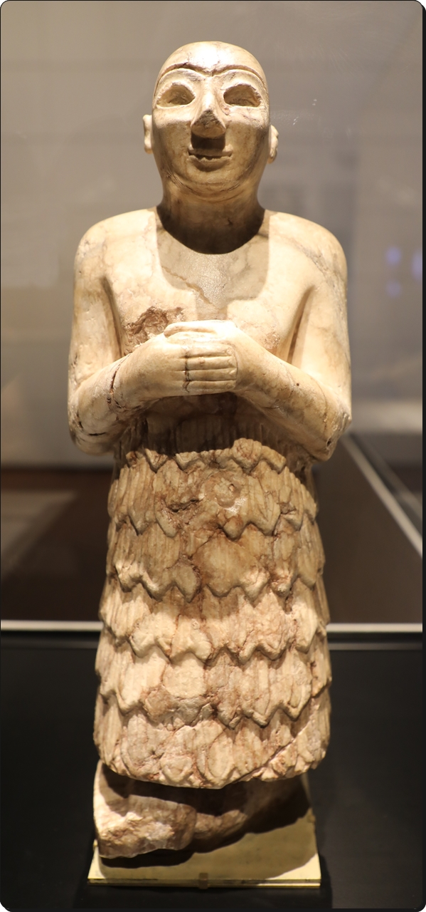 경건한 자세로 건 남성의 모습을 한 원인을 상이다. 눈썹과 눈은 조개껍데기, 청금석 또는 다른 귀금속으로 상감 세공했을 것이다. 초기 왕조 시대에 일반적으로 작용했던 여러 겁으로 싼 치마를 입고 있다. 커다란 눈과 맞잡은 손은 신성에 압도되었다는 뜻이며, 봉헌자들은 신에게 존경을 표한다는 의미로 신전 안에 이러한 값비싼 상을 바쳤다.