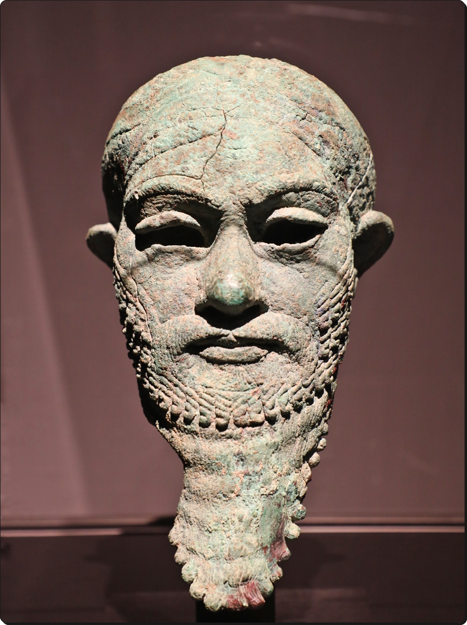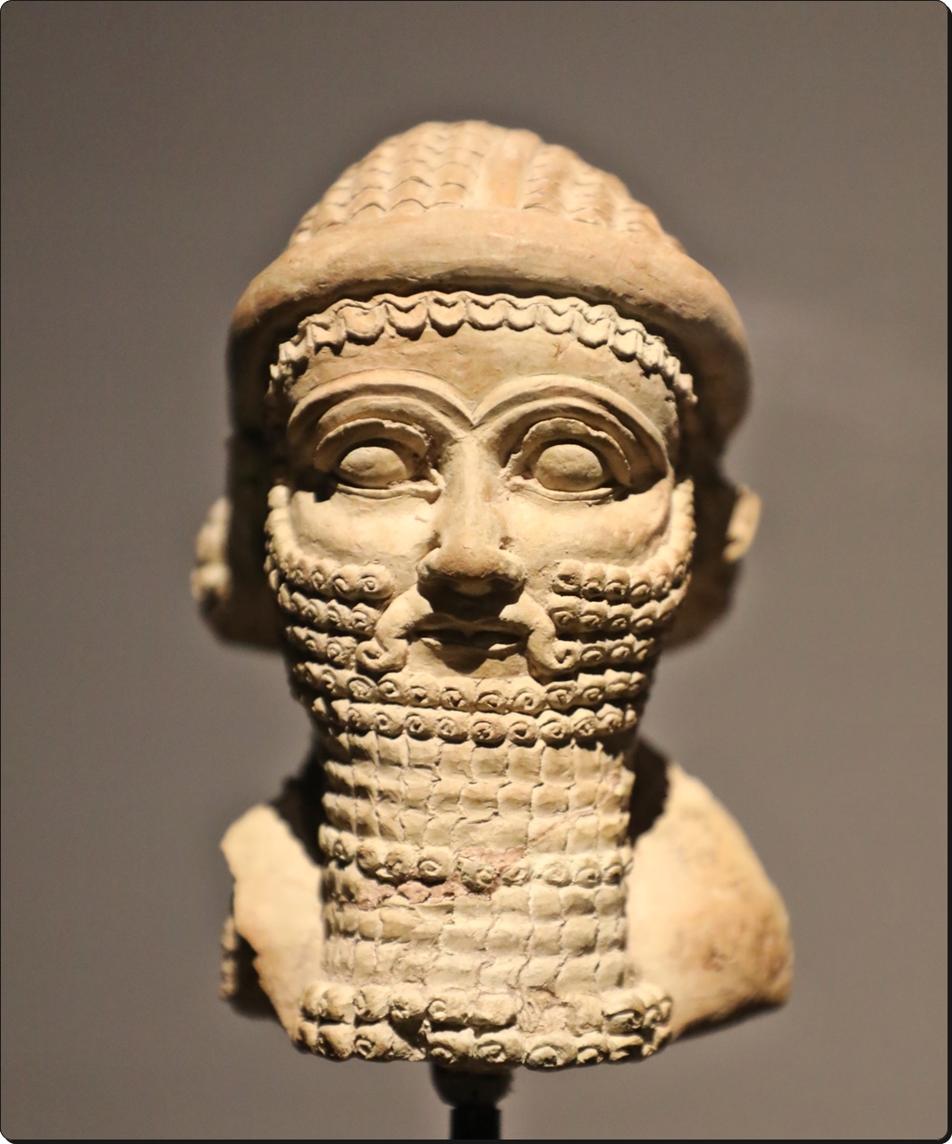 초인적인 존재로 생각되는 이 작은 두상은 눈매가 깊고 눈썹이 두드러지며 수입이 풍성하여 앗슈트왕의 표준 이미지와 유사하다. 끝단을 걸어 올린 관은 메소포타미아 조각에 흔히 나타나지만, 관만 바꿔 싸운다면 신과 왕의 모습이 크게 다르지 않았다. 장인이 다른 재료로 더 큰 상을 만들기 전에 제작해 본 견본이었을 것으로 추정된다.