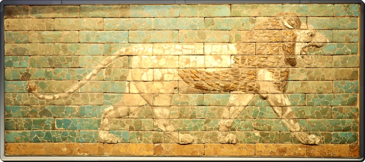 이쉬타르 여신을 상징하는 사자가 표현된 벽돌벽의 일부이다. 청금석처럼 반짝이는 파란색 배경에 사자가 더욱 도드라져 보인다. 표면에는 유약을 발랐다. 이 같은 사자상 120구가 나부쿠두리우쭈르 2세가 세운 이쉬타르 문에서 '신년 축제의 집' 비트 아키투까지 이어지는 행렬 길을 화려하게 장식하였다. 이쉬타르 문의 정면도 아다드 신과 마르둑 신을 상징하는 575구의 황소와 무슈후슈 용으로 꾸며져 있었다.