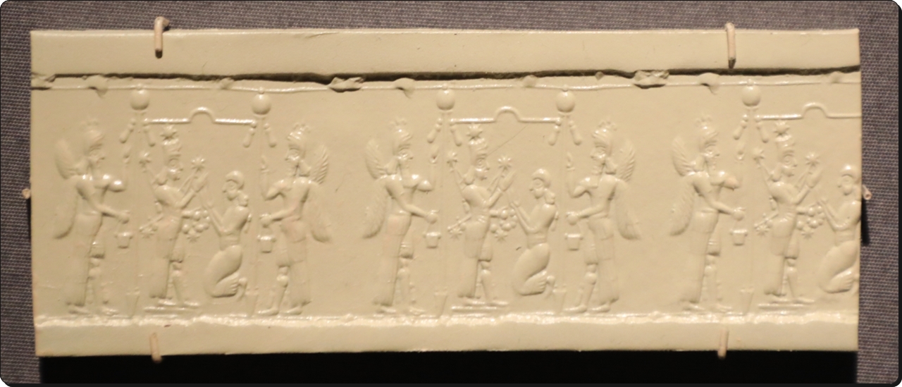 물이 나오는 병을 든 신과 새 머리를 한 정령을 새긴 중-앗슈르 시대의 원통형 인장이다. 신의 모습은 앞 시대의 짐리림 궁전 분수조각과 비슷한 데 반해, 새 머리를 한 정령의 모습은 약 300년 뒤 님루드에 지어진 궁전을 장식한 석판 부조에 직접적으로 영향을 주었다. 이는 원통형 인장에 조각된 이미지는 크기와 무관하게 다른 예술 분야와 영향을 주고받았음을 알려준다.