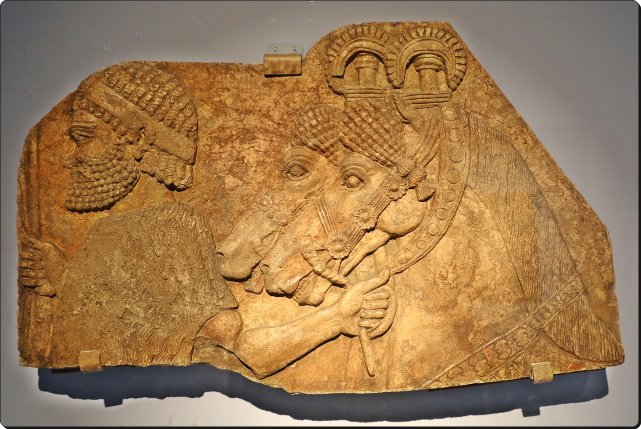 말 두 필을 고삐로 끄는 마부를 묘사한 부조이다. 마구의 정교함이 돋보이는데, 굴레에 앗슈르식 장미 장식이 있고 이마 장식에서 술이 내려오며 머리 위에는 근사한 문장(紋章)이 보인다. 마부는 차림새와 머리 모양으로 보아 앗슈르인이 아닌 외국인이다. 이 부조는 앗슈르에 조공을 바치는 외국 사절단의 모습을 담은 큰 조각의 일부이다.