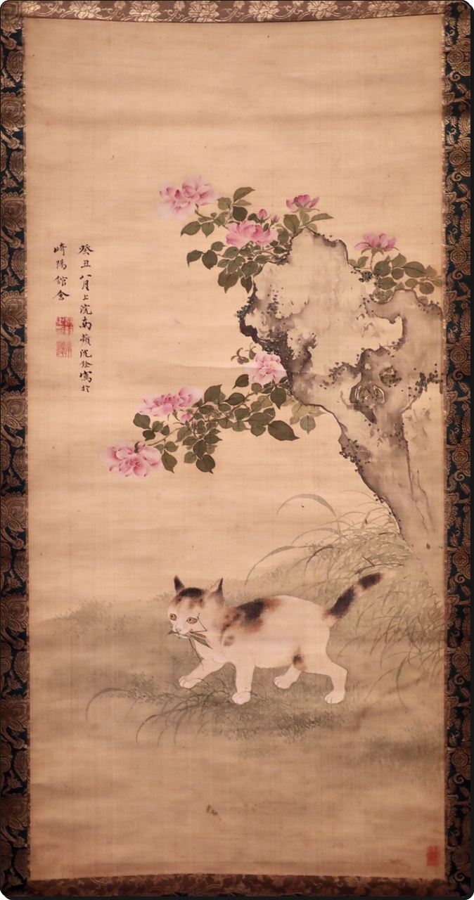 이 작품은 1733년 심전이 일본에서 귀국하기 직전에 그린 것으로 괴석怪石과 장미를 배경으로 고양이 한 마리가 방아깨비를 물고 있다. 괴석은 먹을 퍼지게 하는 발묵潑墨기법으로 그렸고, 장미는 분홍색의 꽃과 짙은 녹색의 잎을 대비시켜 표현하였다. 바닥의 수풀은 가벼운 필치로 그렸고, 고양이는 매우 꼼꼼한 필치로 털의 부드러운 질감을 나타내었다.