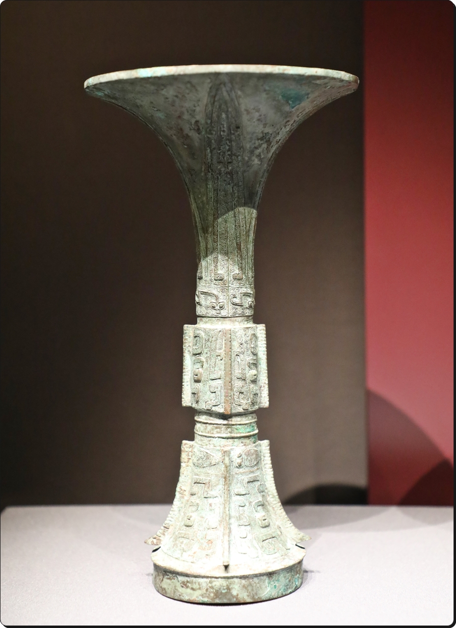 아가리가 나팔 모양으로 벌어지고 굽다리가 있는 술잔이다. 신석기시대는 토기로 제작했고 굽다리가 아닌 평평한 바닥이었다. 청동기로 제작되면서 굽다리로 변화했다. 상나라까지는 굽다리에 십자형 구멍이 있는데, 이 구멍은 안쪽과 바깥 거푸집을 합칠 때 일정한 공간을 유지하기 위해 진흙 덩어리를 끼워 놓았던 흔적으로 청동기 제작 기술이 발전하면서 없어졌다. 술 따르는 의식인 관례祼禮 때 사용한 술잔으로 세발 술잔(爵)과 세트로 서주 전기까지 사용되었다.