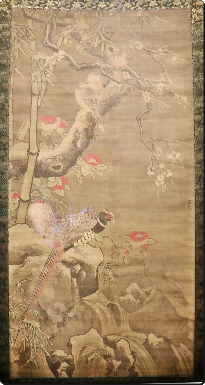 작가 심전은 1731년 일본으로 건너가 약 2년간 체류하며 일본 화가들에게 많은 영향을 미친 궁정 화가로 이 작품은 일본에 가기 직전 그린 것이다. 화면 중앙의 복숭아 종류인 듯한 나무와 그 아래 장미 모두 꽃이 만개해 있고, 위에는 백두조白頭島 두 마리가 서로 마주 보고 울고 있으며 아래 개울가에는 원앙 두 마리가 함께 물을 응시하고 있다.
