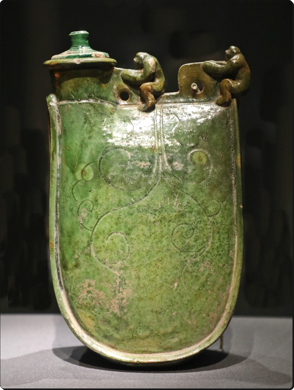 유목 민족이 말을 타고 이동할 때 사용한 가죽 물통을 모방하여 만든 병으로 말안장 모양이다. 전체적으로 녹색을 띠고 유약이 엷게 박락되었다. 원통형 입에 뚜껑이 있으며, 끈을 달 수 있도록 2개의 구멍을 뚫어 놓았다. 각각의 구멍에는 사람이 표현되었고, 몸통 부분에는 음각陰刻으로 꽃잎을 표현했다. 요대遼代에 만든 것으로 추정된다.