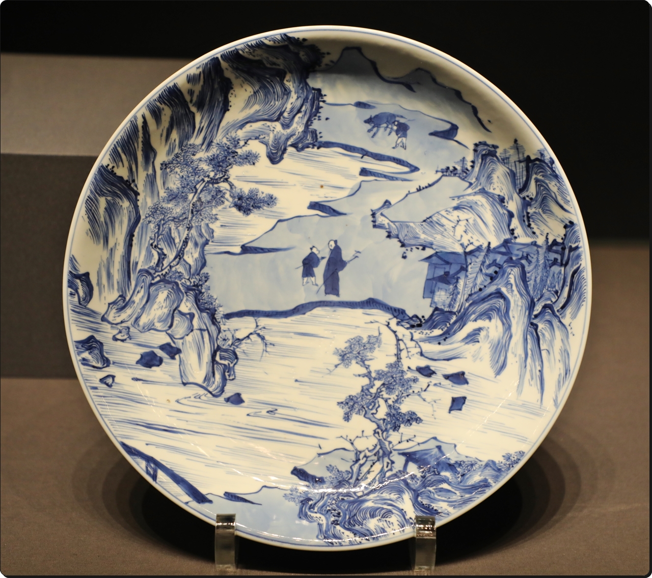 산과 물이 잘 어우러진 자연 속에서 스승과 제자가 서로 마주하고 있다. 접시 바닥에 마치 한 폭의 산수화처럼 자연을