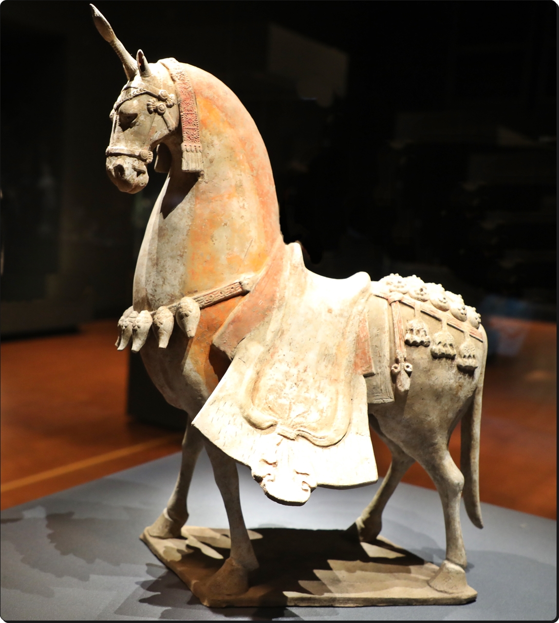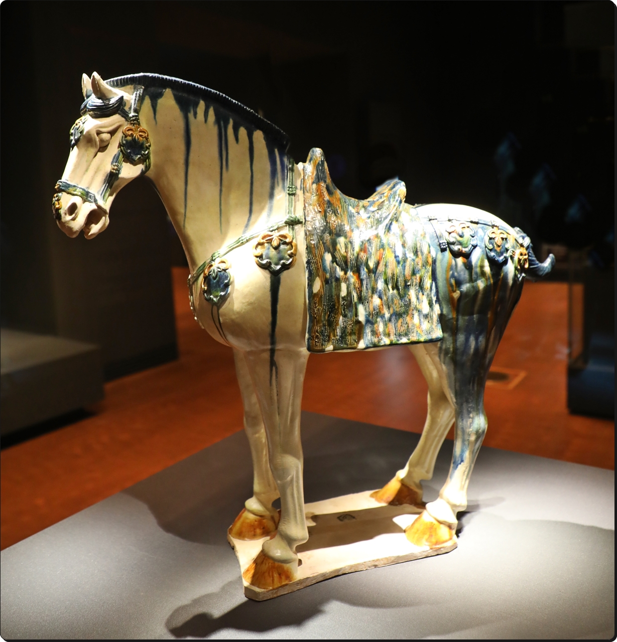 당대唐代 초기 나라에서는 공납, 매매, 전쟁 등을 이유로 주변 여러 나라에서 5천여 마리의 말 70여 종을 수입하였다. 이 중 서역지방에서 수입된 아라비아계통의 말은 작은 머리에 다리가 가늘고 길어 주로 의장용으로 사용되었다. 무덤에는 주로 삼채로 제작하여 함께 묻었다.