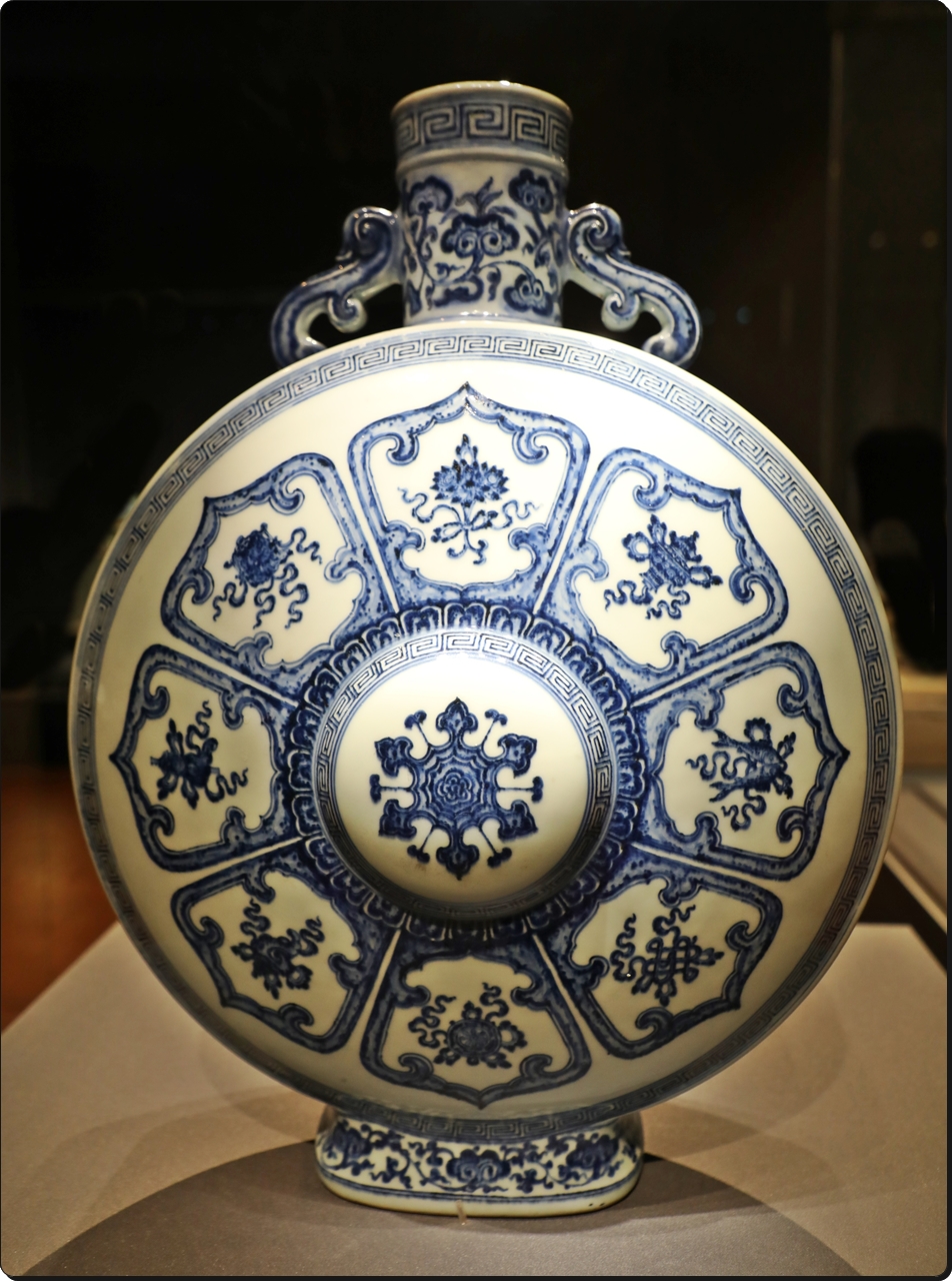 병의 배 부분이 둥근달처럼 볼록 튀어나와 편병이라고 부른다. 배 부분에 보상화를 둘러싸고 있으며 꽃잎 하나하나에는 길상무늬인 바퀴, 소라, 깃, 산, 꽃, 병, 물고기, 매듭이 그려져 있다. 몸체 바탕의 가장자리는 회문文을 두르고 옆면은 넝쿨무늬로 장식했다. 청대 건륭乾隆(1737~1795) 연간에 제작되었다.