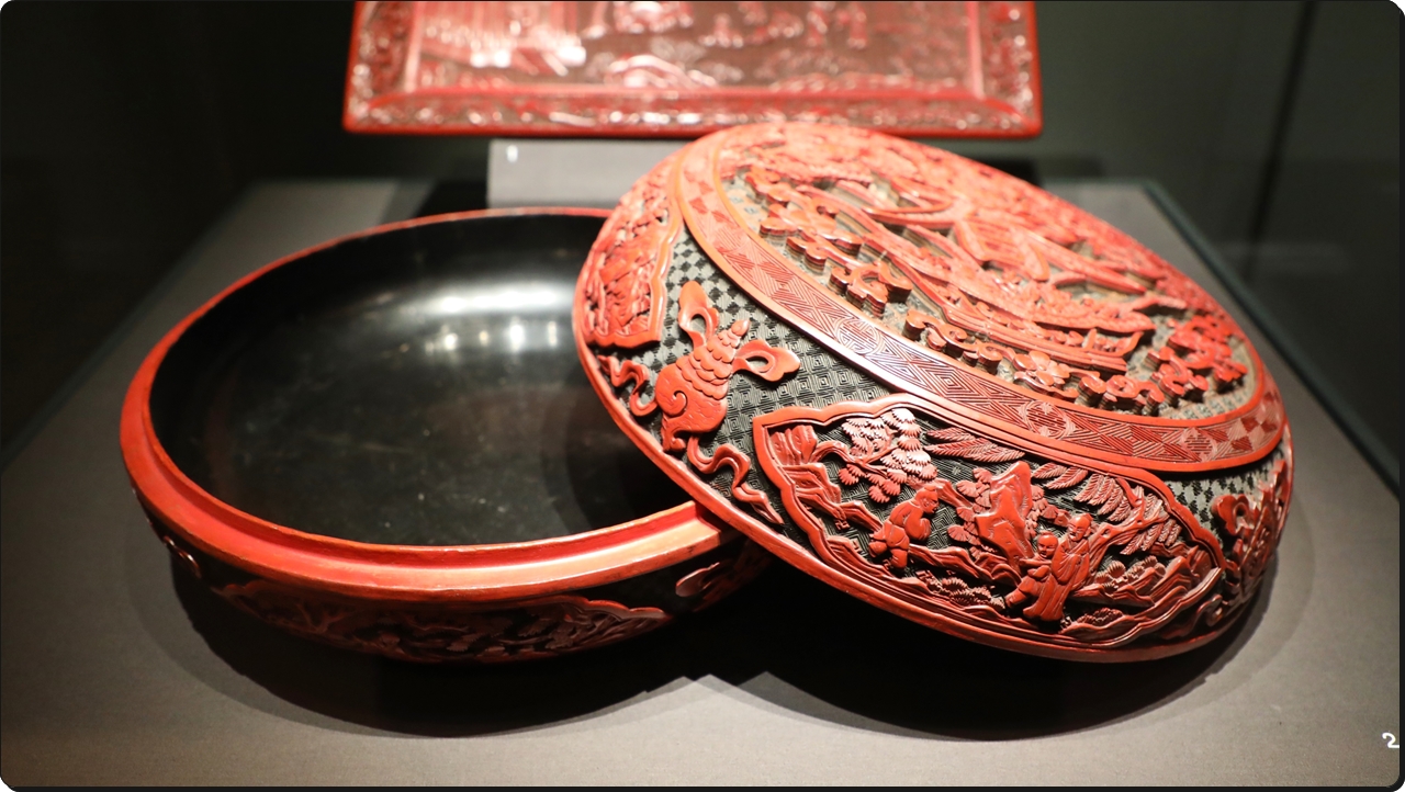 이 칠합은 다양한 제작 기법과 기교로써 최상의 화려함을 표현한 청대 공예품이다. 조칠彫漆 기법으로 만들었으며, 여러 번 칠한 칠층漆䁬의 색감 변화로 입체감과 화려함을 극대화했다.