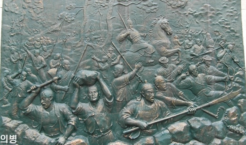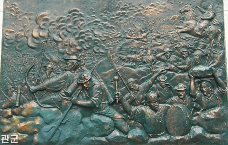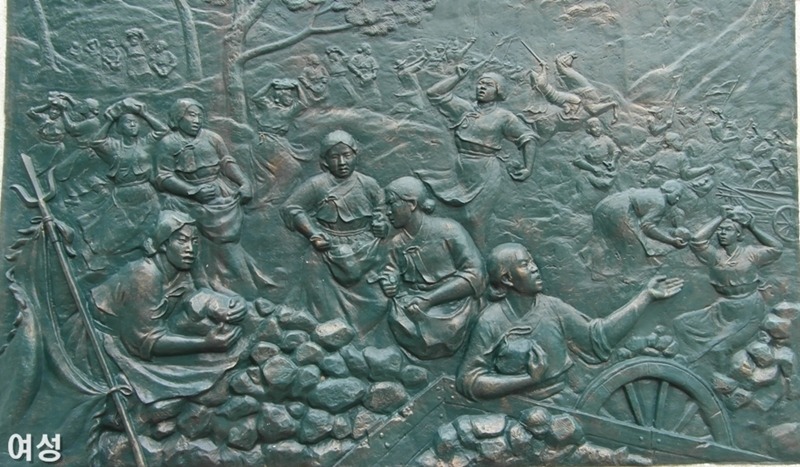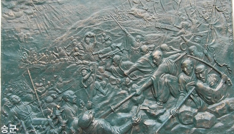 동상 뒤쪽에 관군, 승병, 의병, 여성들의 항전 모습을 새긴 부조를 각각 담아 본다