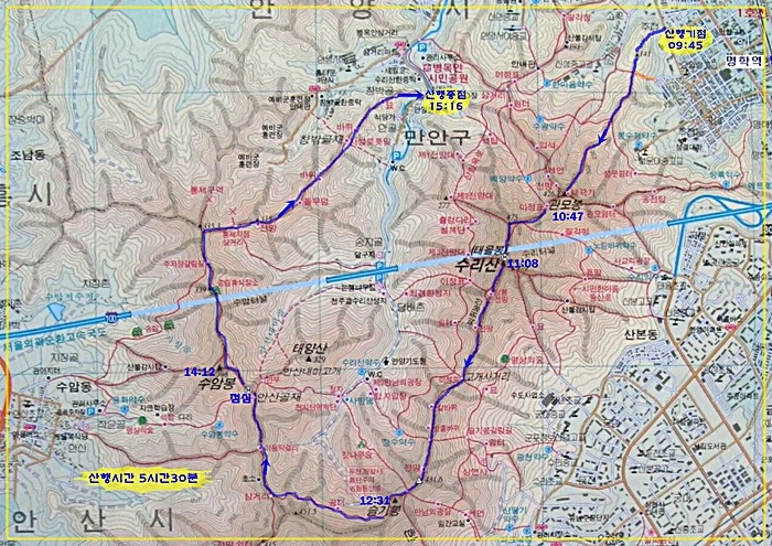 기록을 보니 '11.1.18.토요일 영하 7도인 날씨에 성결대학을 등산기점으로 10시부터 산행을 시작하여 수리산 종주를 끝낼 때가 15:30이니 오늘과 산행시간이 같다.