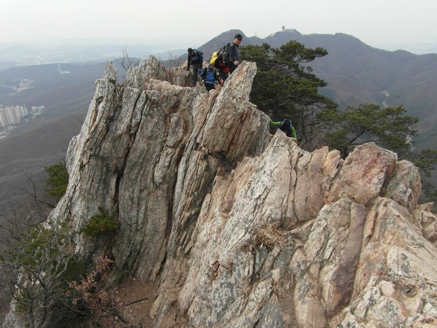 하여 이곳에 슬기봉이란 푯말을 설치, 일군의 산객들이 안양을 조망하고...
