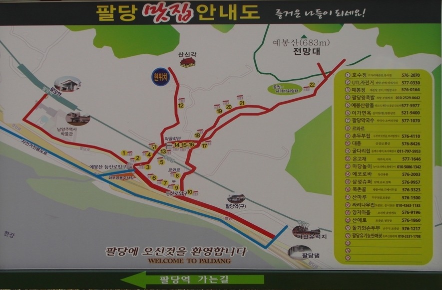산 아래 맛집 안내도에 팔당역 방향이 표시되어 있는 데 보지 못 하고 직진하는 바람에 한참을 돌아 팔당역에 도착했다.