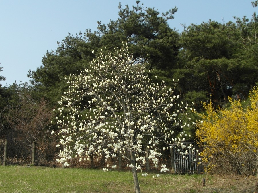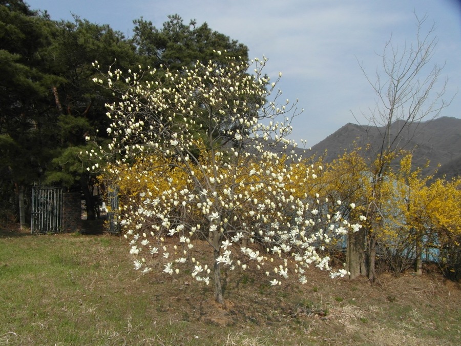어느 울타리 쳐진 산소에 들어가니 개나리꽃과 목련꽃이 심심했는 지 상춘객을 즐겨 반긴다.