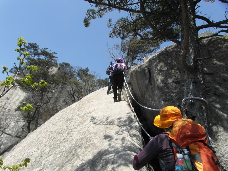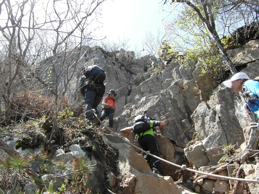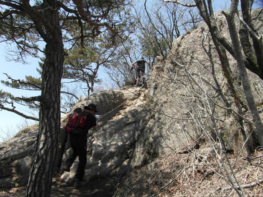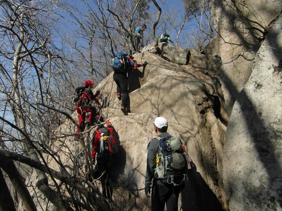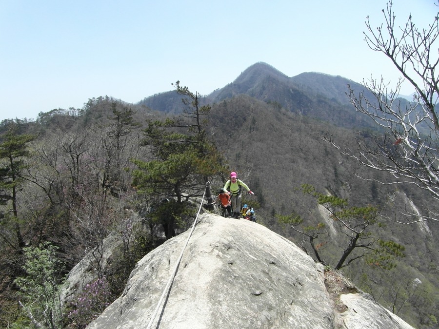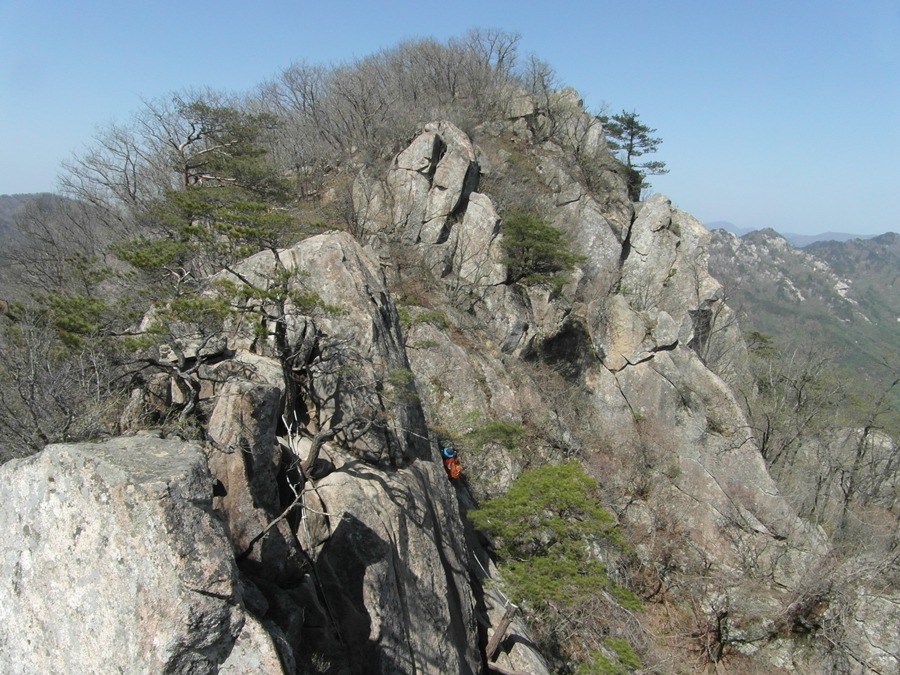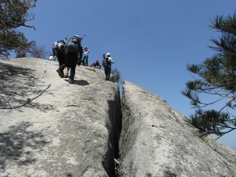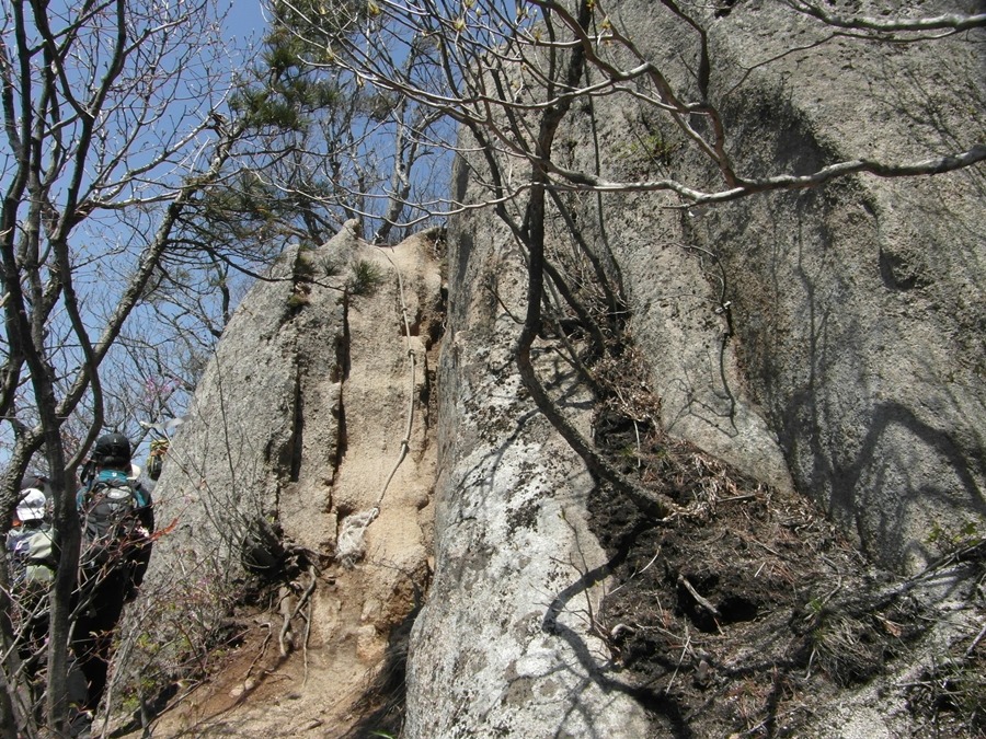 바위 사이를 어렵게 통과하면 로프를 잡고 내려서자마자 곧바로 암봉을 타고 올라야 하는 난코스의 연속이다
