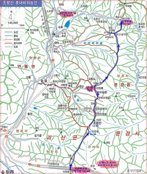 차량을 돌려 다른 구 이화령에서 산행을 시작하여 방향이 180도 틀어져 문경을 반대 방향으로 착각해 일어났던 해프닝이다.