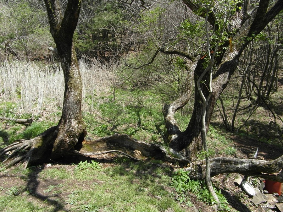 두 나무가 하나로 연결된 연리지인데, 아래로 연결된 가지는 이미 죽은 상태다