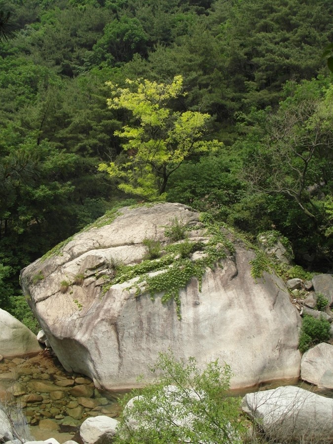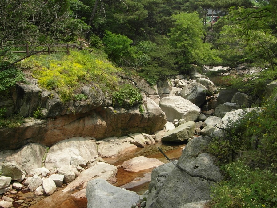 계곡의 바위엔 돌나물에 꽃이 피어 노란색을 보인다