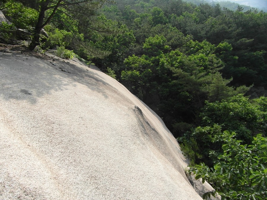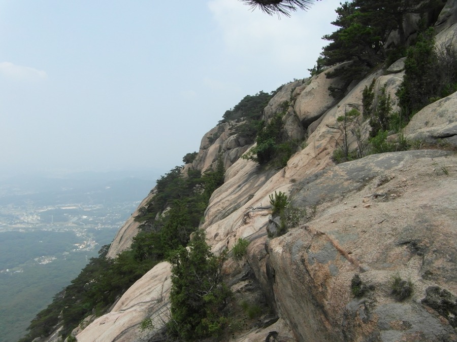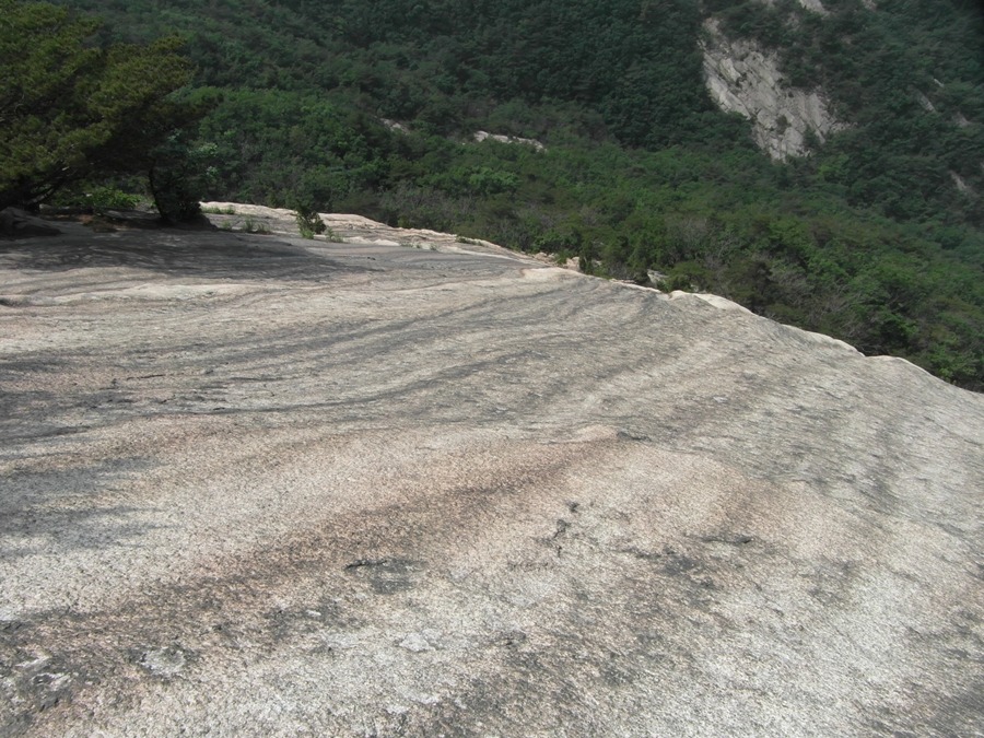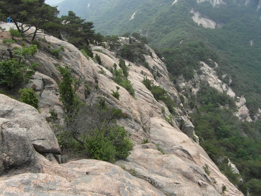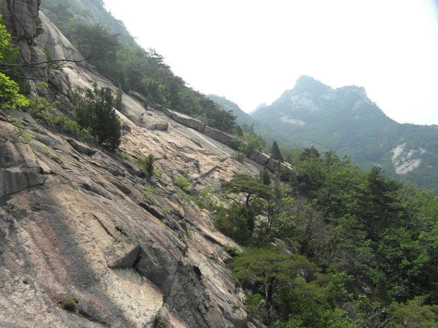 그 반대편 남쪽 사면은 슬랩과 암벽으로 이루어져 마땅히 길을 낼 수 없는 구간이라 고도의 릿지 기술이 없으면