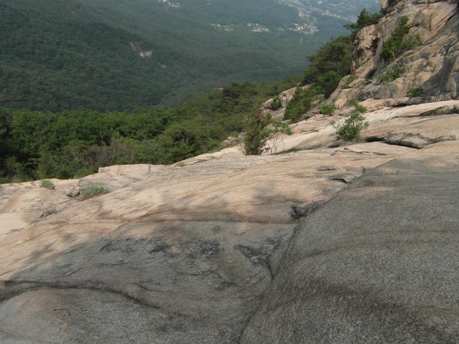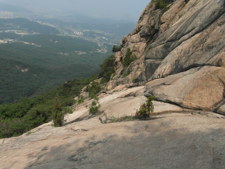 슬랩을 질러가기에 앞서 혹시라도 실수하여 굴러 떨어지면 최종 종착지가 어디가 될지, 중간에 어디쯤이 낙하지점일지 목측하며 안전지대를 훝어본다