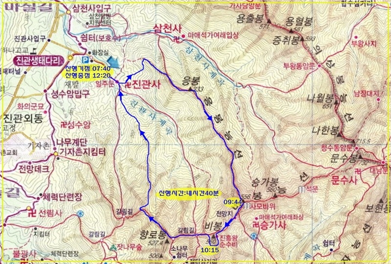 진관사 입구에 도착하여 왼쪽 삼천사 넘어가는 고개에서 응봉능선으로 들머리를 잡는다.