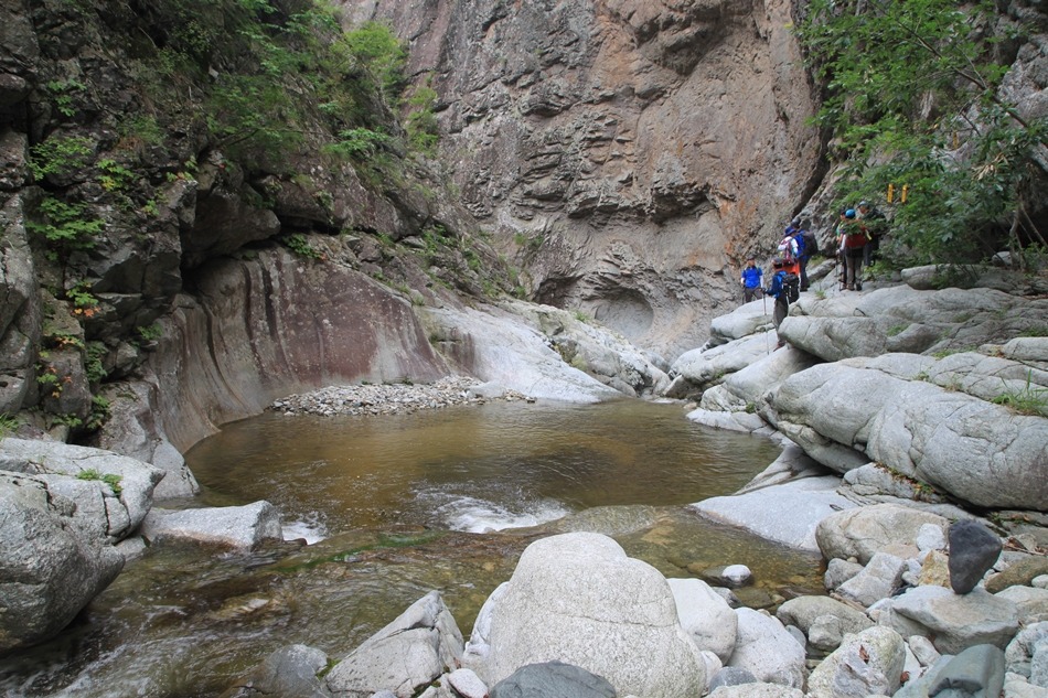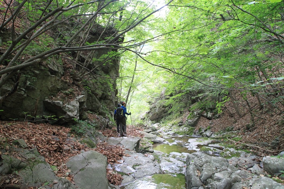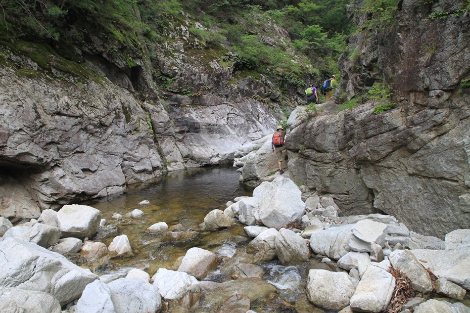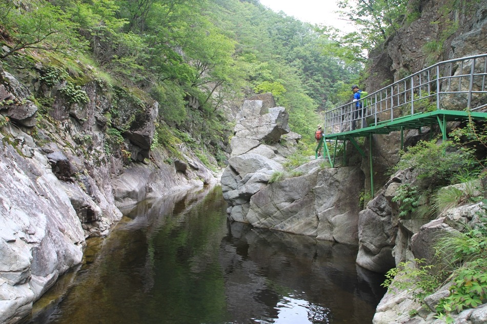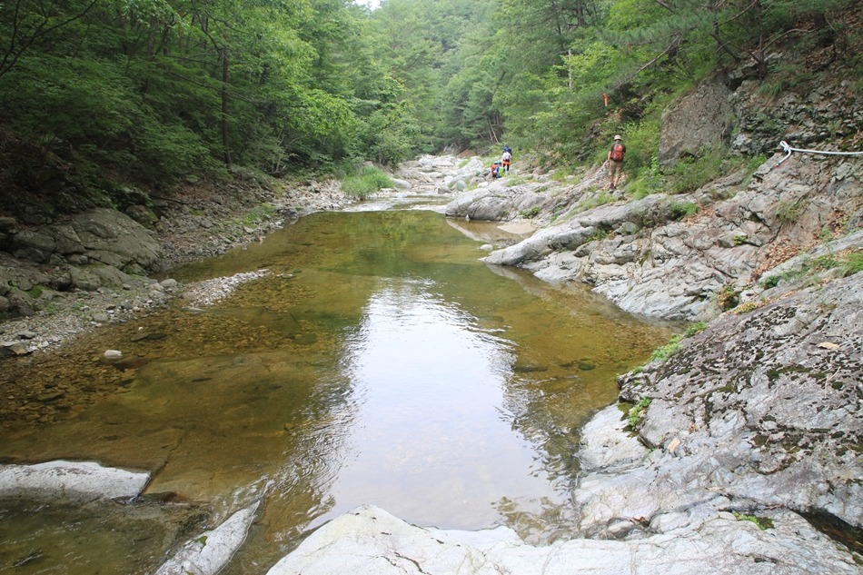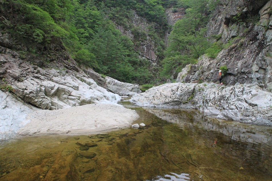 계곡이 꽉막힌듯 보이는 이곳은 덕풍계곡의 가장 위험스런 협곡이다.