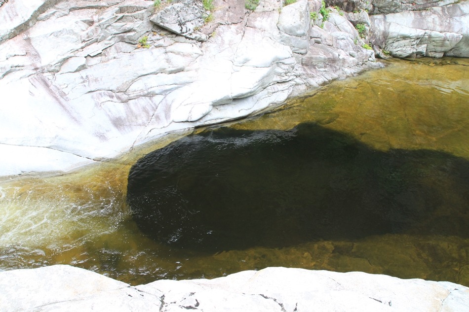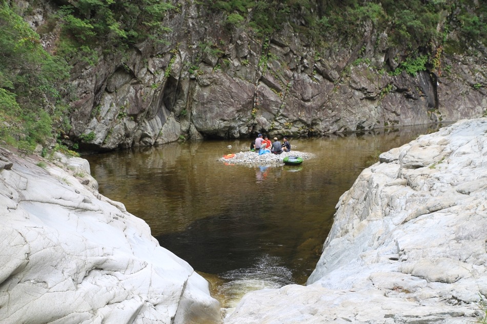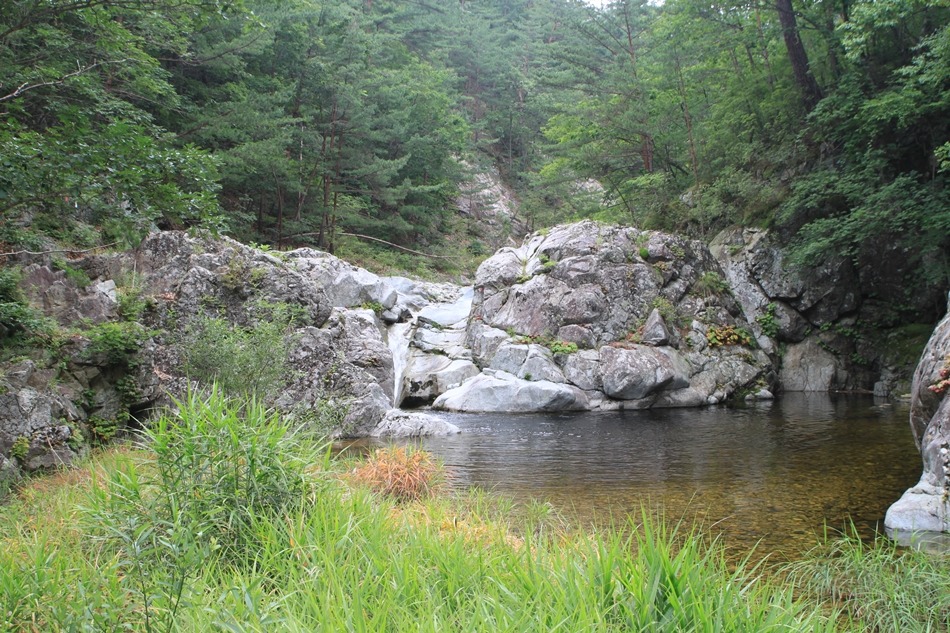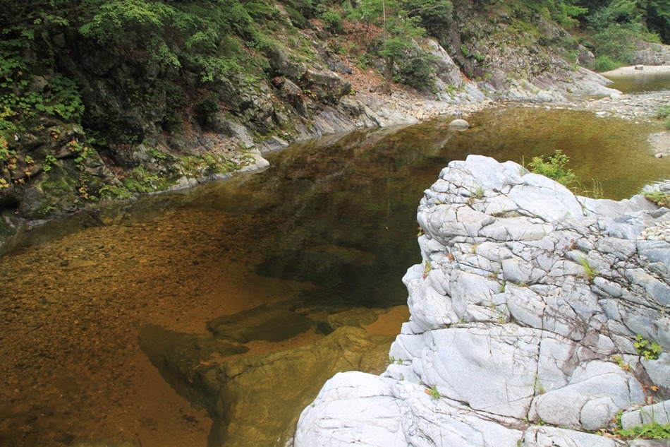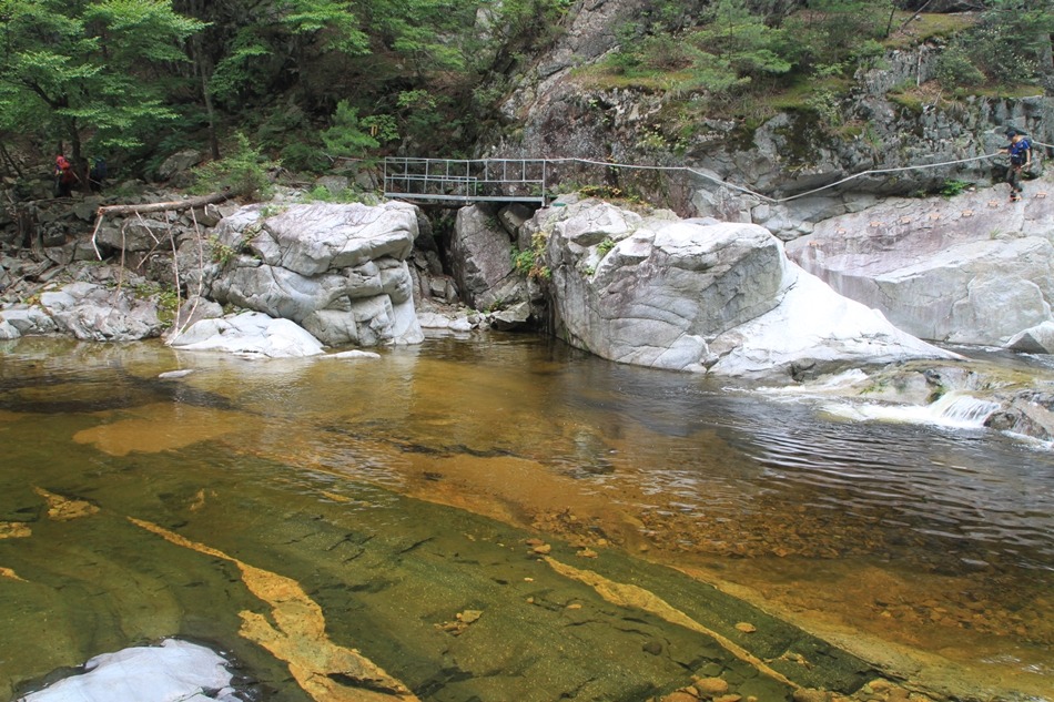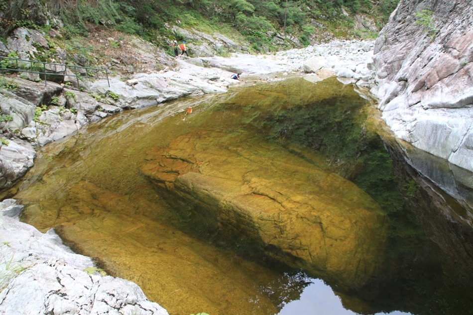 제1용소폭포는 저 귀퉁이만 돌면 속을 알 수 없는 흑갈색이지만 이곳은 언제 그랬느냐는듯 잔잔고 넓은 황갈색 소를 보여주니 천의 얼굴을 가진 신비계곡이다.