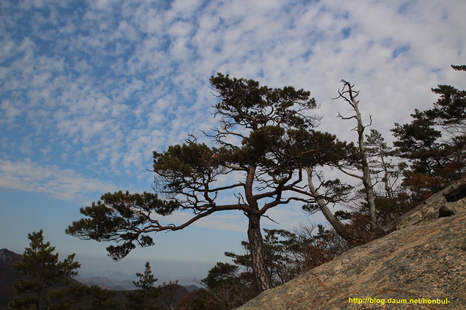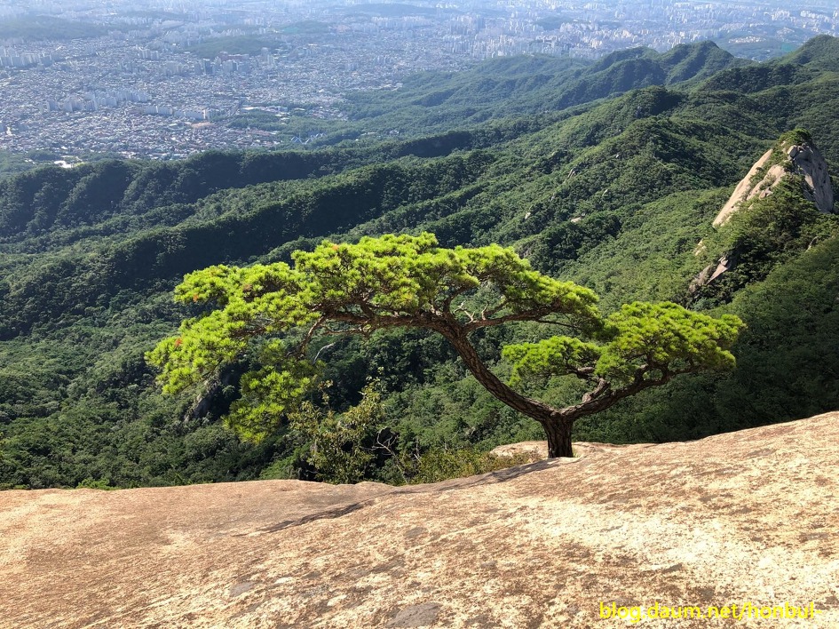 바람 많은 노적봉의 소나무는 생존을 위해 옆으로 더 많이 펼쳐져 북한산 소나무 중에서 가장 멋진 형태다.