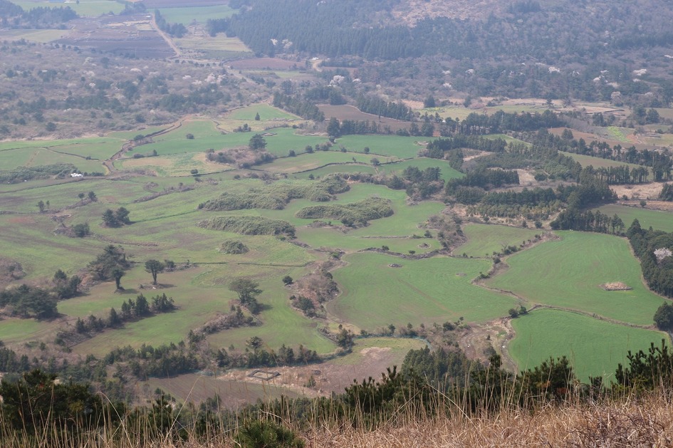 가까운 오름 오른쪽에 폭넓게 형성된 숲은 잠시 후에 가게 될 비자림이다. 점점이 벚꽃도 보인다.