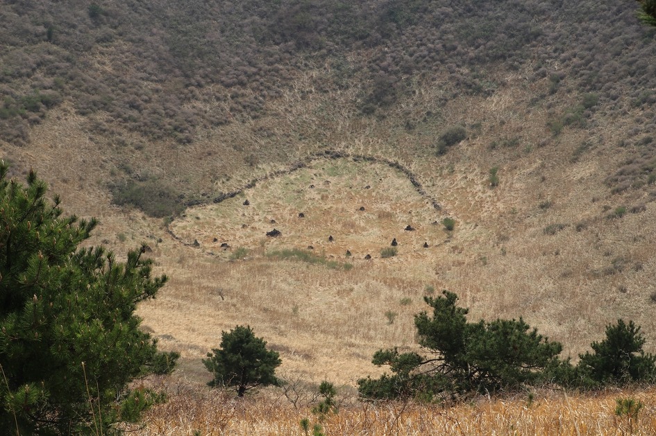 굼부리엔 무슨 의미인지 모르지만 작은 돌담으로 둘러쳐져 있고, 안쪽엔 돌담도 몇 개 보인다.