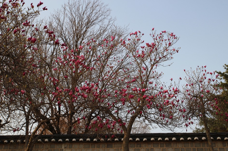 고려궁지로 올라와 담장 밖에 핀 자목련을 본다.