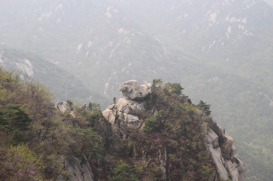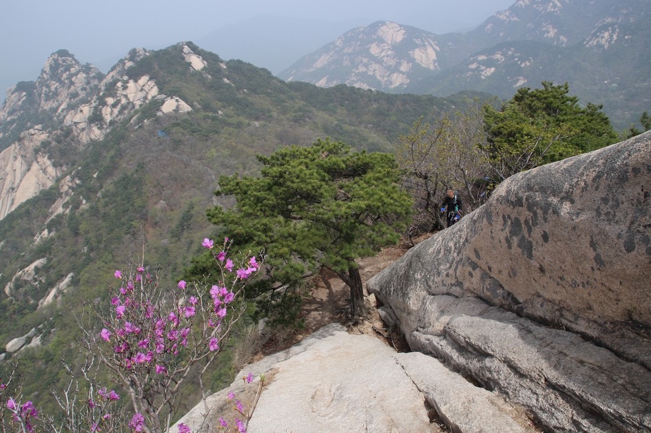 여기서 보이진 않지만, 저 엄지바위 중간에 있는 진달래나무 한두 가지는 생명이 다했으나 살아 있는 가지에 꽃이 핀 게 경이롭다.