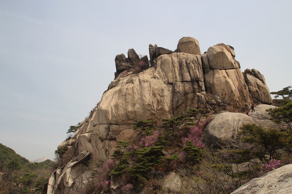 에스컬레이터바위를 타기 위해 오를 때 만나는 소나무 주위의 진달래가 예쁘다.