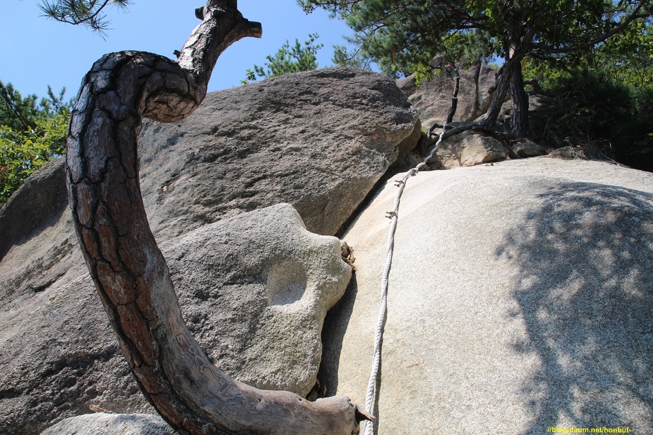 이 소나무와 아래 있는 바위는 얼마나 많은 사람들이 발을 디뎠느지 소나무는 속살을 드러내고 바위는 움푹 파였다.